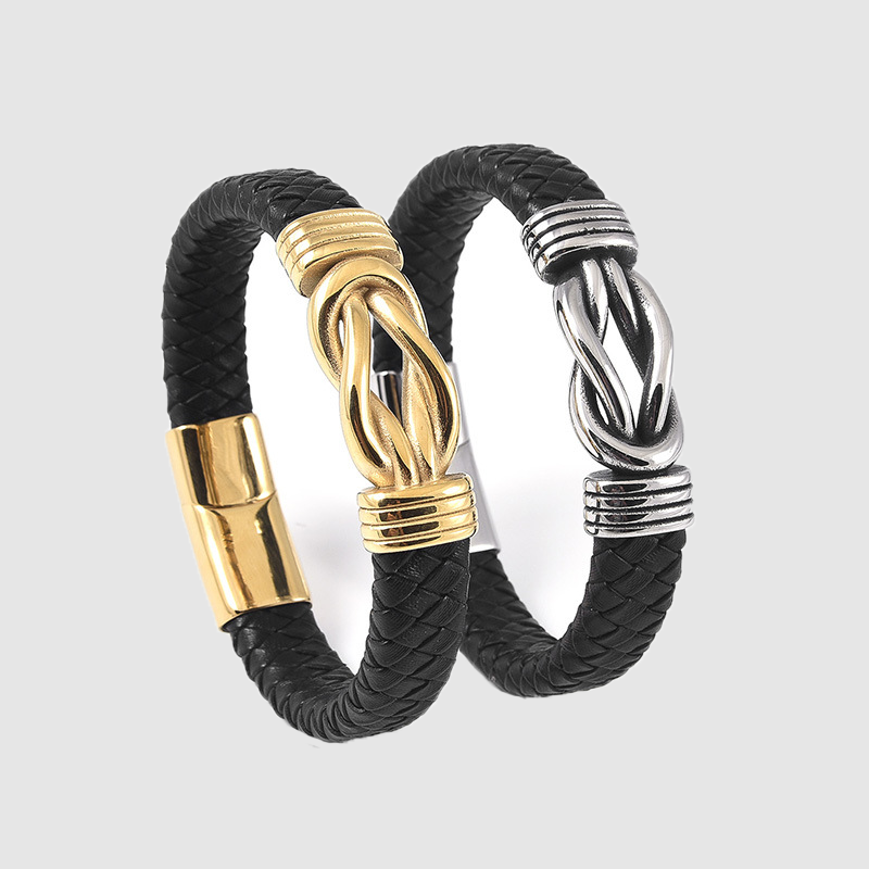 Men's leather woven titanium steel bracelet vintage stainless steel leather bracelet