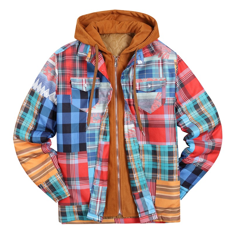 Men's Fashion Casual Plaid Quilted Hooded Fake Two-piece Jacket
