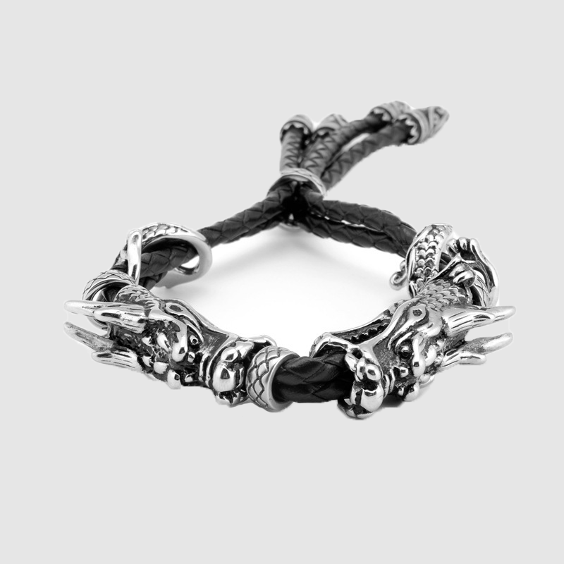 Men's titanium steel double Dragon leather bracelet titanium steel leather accessories
