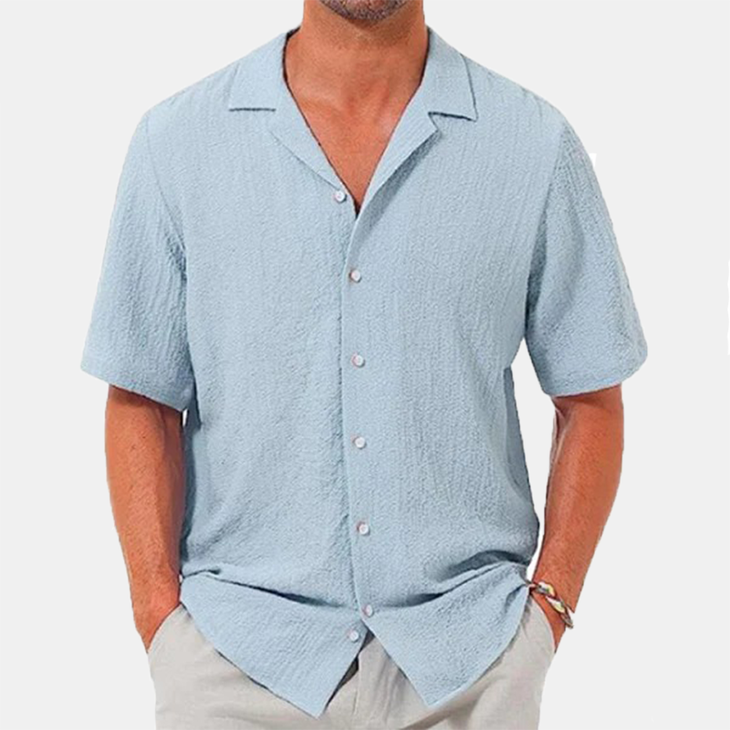 Men's lapel casual solid color short sleeve button linen shirt