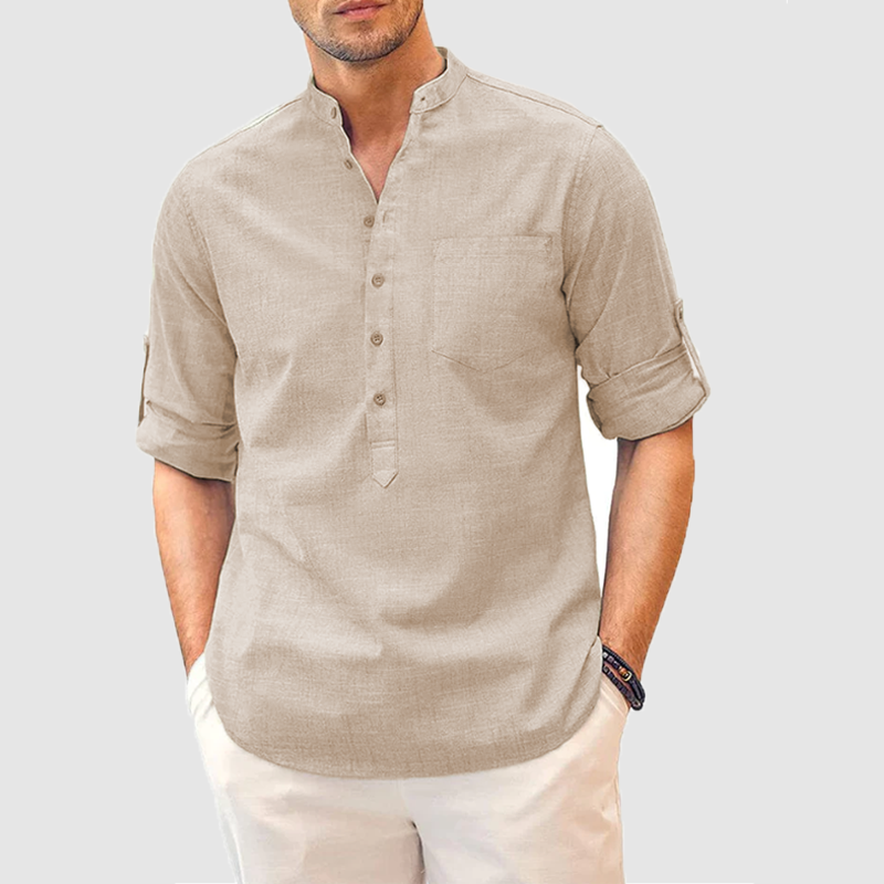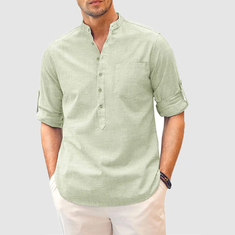 Cotton men's solid color standing collar buttoned pocket simple shirt